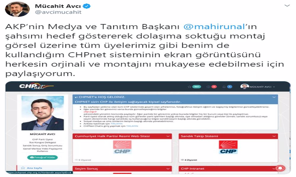 CHP'li Mücahit Avcı ise CHPnet sisteminin orjinal görselini paylaştı: "AKP’nin Medya ve Tanıtım Başkanı @mahirunal’ın şahsımı hedef göstererek dolaşıma soktuğu montaj görsel üzerine tüm üyelerimiz gibi benim de kullandığım CHPnet sisteminin ekran görüntüsünü herkesin orjinali ve montajını mukayese edebilmesi için paylaşıyorum."