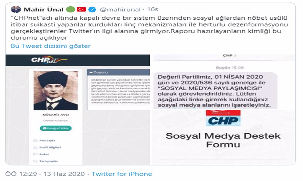 Sosyal medya şirketi Twitter, AKP gençlik kolları gibi hükümetle bağlantılı aktörlerin propaganda ve hedef gösterme amaçlı kullandığı sahte ve ele geçirilmiş 7 bin 340 hesabı sildi. Twitter’dan Aktrollere darbe! AKP bağlantılı binlerce hesap kapatıldı Twitter'ın trol hesapları silmesine tepki göstererek kol kanat geren AKP Tanıtım ve Medyadan Sorumlu Genel Başkan Yardımcısı Mahir Ünal CHPnet sistemini montajlayarak, 'bunlar Twitter’ın ilgi alanına girmiyor' dedi. Ünal, paylaşımında, "CHPnetadı altında kapalı devre bir sistem üzerinden sosyal ağlardan nöbet usülü itibar suikasti yapanlar kurdukları linç mekanizmaları ile hertürlü dezenformasyonu gerçekleştirenler Twitter’ın ilgi alanına girmiyor.Raporu hazırlayanların kimliği bu durumu açıklıyor" ifadelerini kullandı. AKP’de FETÖ çatlağı büyüyor! Hedefte Mahir Ünal var…