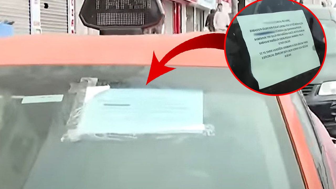"... Plakalı bu araç babasının ölmeden evlatlarına pay ettiği mirasçısı ... Yüzünden çalışamamaktadır. Babasının tek gelir kaynağına haciz koydurarak babasını mağdur eden kızıma hakkımı helal etmiyorum. 55 yıl emek verdiğim arabamı evinin önüne park ediyorum. Ömrüm boyunca kızıma son sözüm budur."
