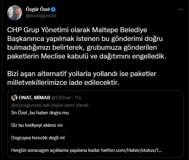 "CHP Grup Yönetimi olarak Maltepe Belediye Başkanınca yapılmak istenen bu gönderimi doğru bulmadığımızı belirterek, grubumuza gönderilen paketlerin Meclise kabulü ve dağıtımını engelledik. Bizi aşan alternatif yollarla yollandı ise paketler milletvekillerimizce iade edilecektir."