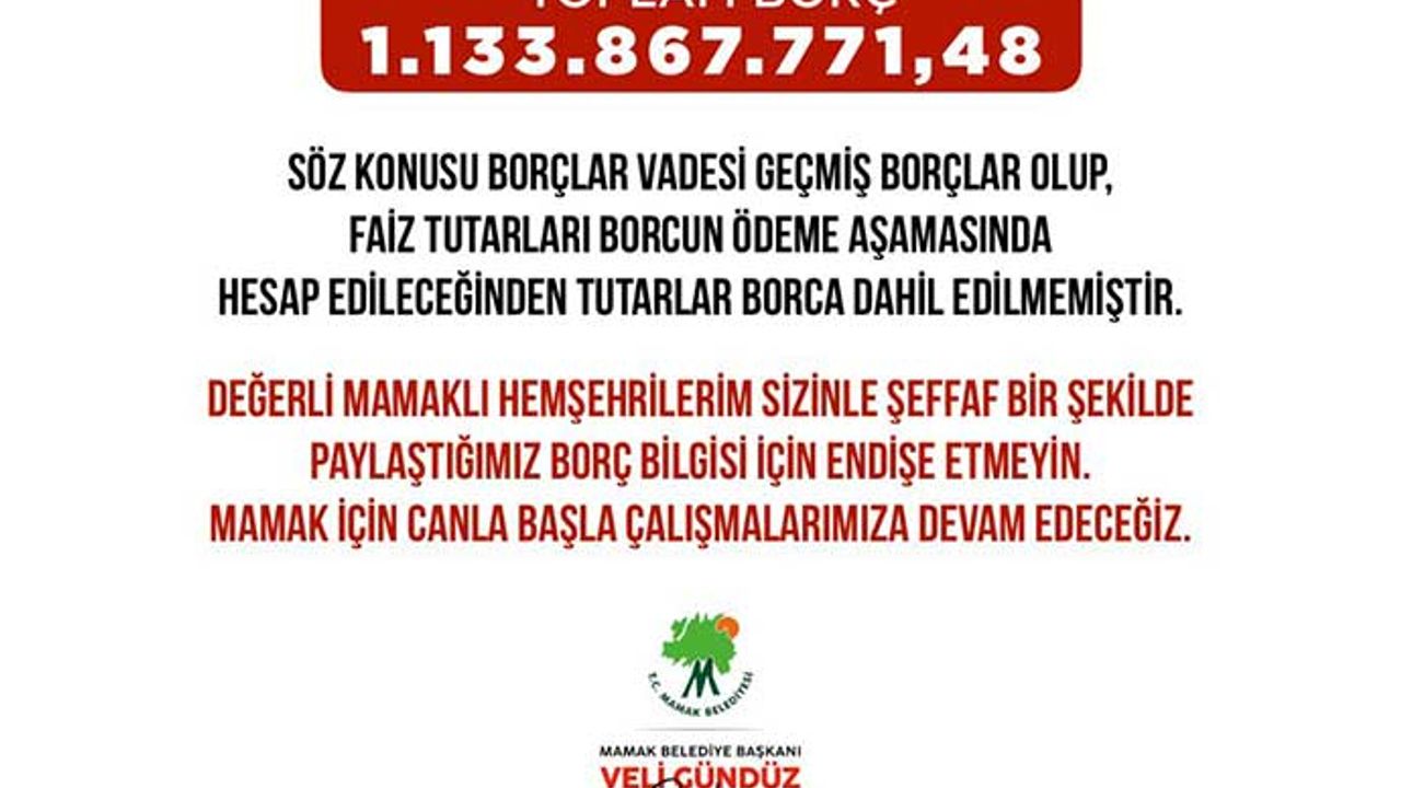 Buna göre Mamak Belediyesi’nin borcunun faizleri hesaplanmamış hali 1 milyar 133 milyon 867 bin 771 lira. Tüm borçların vadesi geçmiş olup, faiz tutarları borcun ödeme aşamasında hesap edileceğinden faiz tutarları borca dâhil edilmedi. Belediyenin kalem kalem borçları ise şu şekilde: Banka kredi borçları: 440 milyon 867 bin 195 lira Belediye Personel Ltd. Şti'ne ait borçlar: 334 milyon 893 bin 400 lira Firma Borçları: 212 milyon 171 bin 357 lira Vergi Dairesi borçları: 45 milyon 603 bin 230 lira Kamulaştırmalar: 33 milyon 846 bin 628 lira Belediye Mabel A.Ş.’ye ait borçlar : 22 milyon 639 bin 190 lira Toplu Konut İdaresi Başkanlığı: 15 milyon 136 bin 669 lira Ankara Yatırım İzleme Koordinasyon Başkanlığı: 12 milyon 844 bin 851 lira SGK prim borçları: 9 milyon 870 bin 490 lira Personele ilişkin borçlar: 3 milyon 807 bin 826 lira Sosyal destek yardımları: 2 milyon 186 bin 931 lira