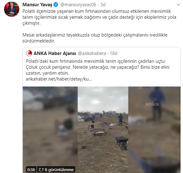 Twitter hesabından paylaşım yapan başkan Mansur Yavaş, "Polatlı ilçemizde yaşanan kum fırtınasından olumsuz etkilenen mevsimlik tarım işçilerimize sıcak yemek dağıtımı ve çadır desteği için ekiplerimiz yola çıkmıştır.