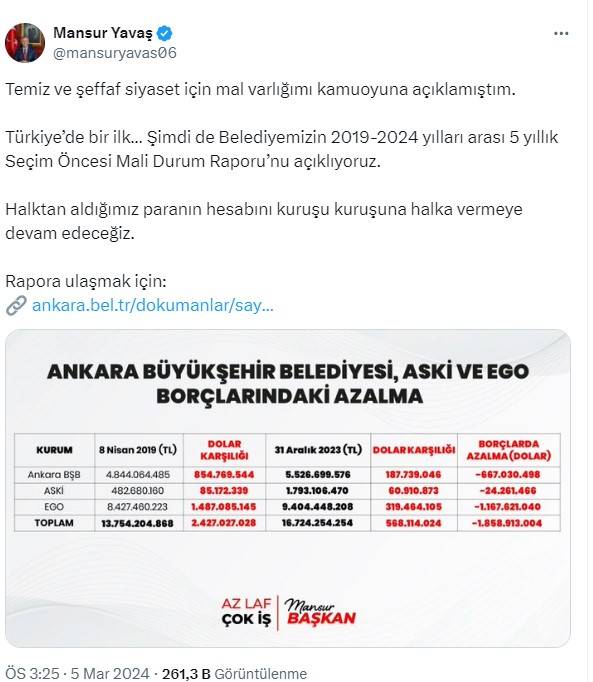 Ankara Büyükşehir Belediye (ABB) Başkanı Mansur Yavaş, Belediyenin beş yıllık 'Seçim Öncesi Mali Durum Raporu’nu açıkladı. ABB'nin web sitesinde yayınlanan raporu sosyal medya hesabından duyuran Yavaş, bunun Türkiye'de bir ilk olduğunu söyledi. Rapora göre; Yavaş’ın göreve geldiği 8 Nisan 2019 tarihi ile 31 Aralık 2023 tarihi arasındaki gelişmeleri gösteren mali tabloların açıklandığı rapora göre, borçlarda 5 yılda 1 milyar 858 bin 913 dolar azalma oldu. Yavaş, paylaşımında şu ifadeleri kullandı: "Temiz, şeffaf siyaset için mal varlığımı kamuoyuna açıklamıştım. Türkiye’de bir ilk… Şimdi de seçimden sonra Belediyeyi nasıl devir aldığımızı ve seçime giderken nereye getirdiğimizi gösteren Belediyemizin 2019-2024 yılları arası 5 yıllık mali işlemlerimizdeki gelişmeleri gösteren Seçim Öncesi Mali Raporu’muzu açıklıyoruz. Halktan aldığımız paranın hesabını kuruşu kuruşuna halka vermeye devam edeceğiz."