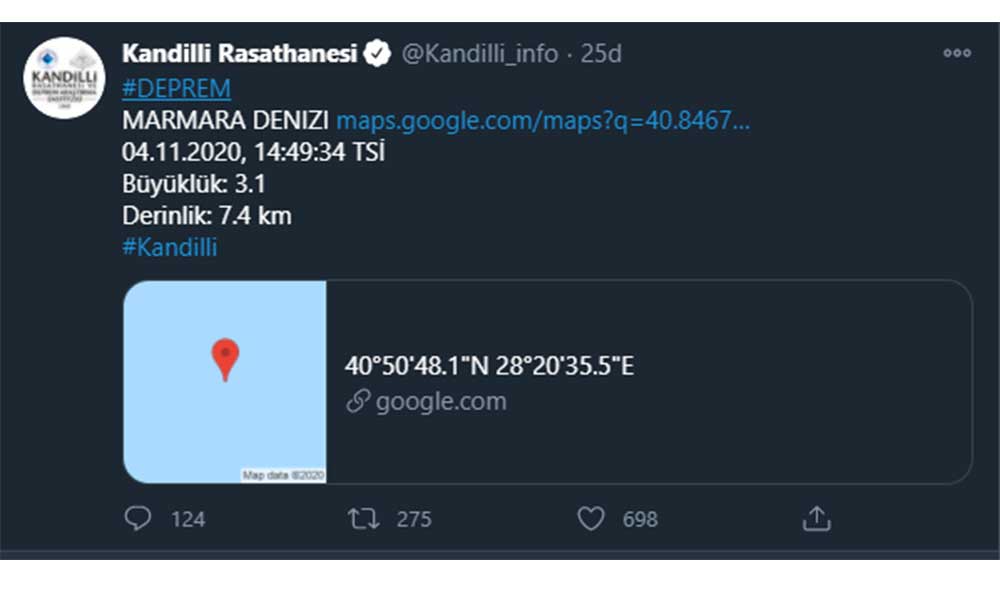 Marmara Denizi'nin Silivri-Büyükçekmece açıklarında yerin 7.4 kilometre derinliğin 3.1 büyüklüğünde bir deprem meydana geldi. Kandilli Rasathanesi tarafından yapılan açıklamada saat 14:49'de meydana gelen depremin 3.1 büyüklüğünde olduğu belirtildi.