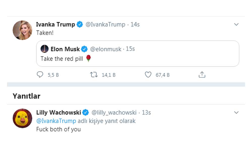 ABD'li yatırımcı Elon Musk ile ABD Başkanı Trump'ın kızı Ivanka Trump arasında geçen "Kırmızı hapı al" göndermesine, Matrix serisinin senaristliği ve yönetmenliğini yapan Wachowski kardeşlerden Lilly Wachowski, küfürle yanıt verdi.