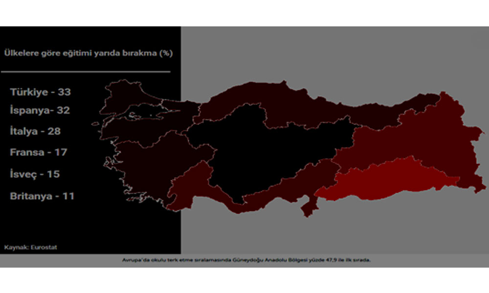 Türkiye’de son 10 yılda eğitime erişimde önemli artış görülürken eğitimini yarıda bırakıp okulu terk etme durumu ciddi bir sorun haline geldi. Avrupa İstatistik Ofisi’nin (Eurostat) verilerine göre Türkiye, Avrupa ülkeleriyle kıyaslandığında okulu erken bırakma alanında ilk sırada yer alıyor. Eğitimini yarıda bırakanların sayısı bölgelere göre farklı. Doğu ve Güneydoğu Anadolu bölgesinde okulu terk edenlerin oranı diğer bölgelere oranla daha fazla.