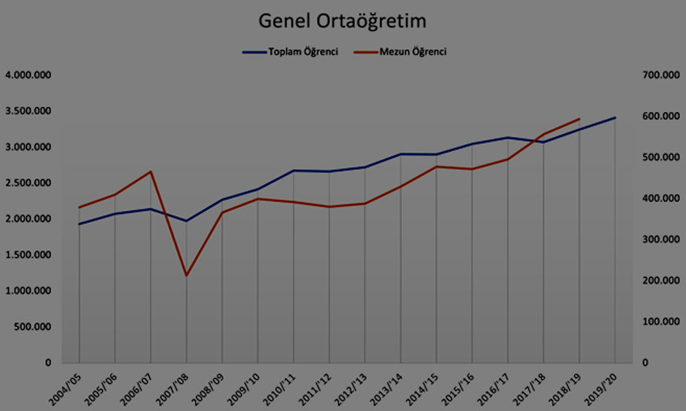 Liseye yeni başlayanların sayısı 2005’te 1 milyon 937’ken bu rakam 2015’te 2 milyon 902 bine yükseldi. Liseye başlayanların sayısı yükseldi ama mezun olanların sayısında değişme yok denecek kadar az.