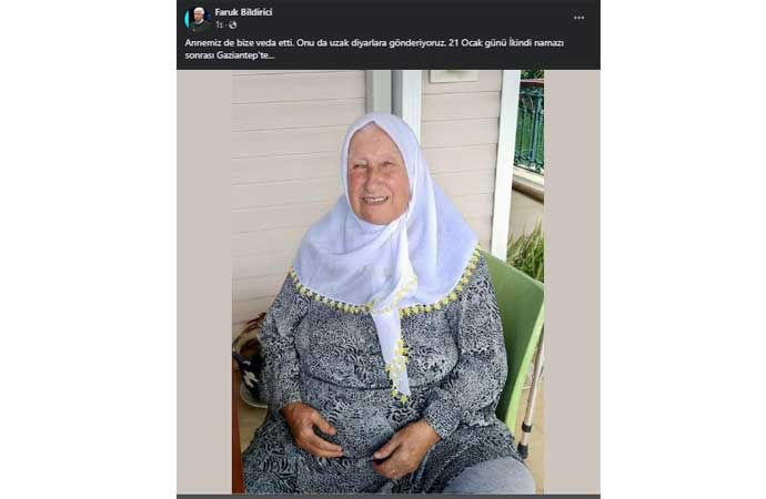 Haberi sosyal medya hesabından duyuran Bildirici, "Annemiz de bize veda etti. Onu da uzak diyarlara gönderiyoruz. 21 Ocak günü ikindi namazı sonrası Gaziantep'te..." ifadelerini kullandı.