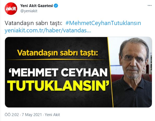 Sosyal medyada Ceyhan'a karşı yürütülen hedef gösterme kampanyasına destek verenlerden biri de gerici Yeni Akit gazetesi oldu. Gerici Yeni Akit gazetesi 'MehmetCeyhanTutuklansın' etiketiyle yapılan sosyal medya paylaşımlarını şu sözlerle haberleştirdi: