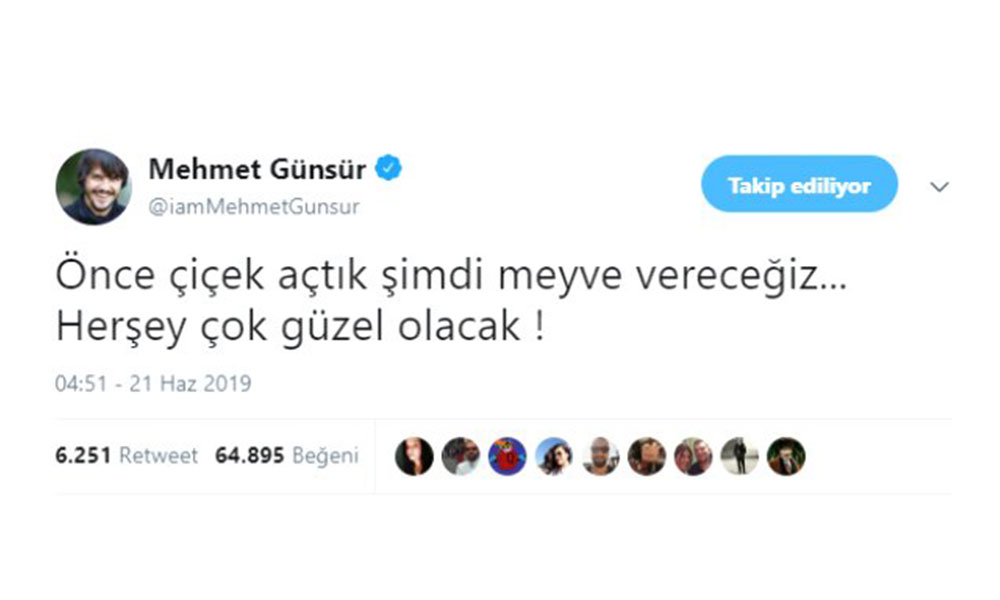 Twitter hesabından 23 Haziran'da gerçekleşecek olan İstanbul seçimi öncesi mesaj yayınlayan ünlü oyuncu Mehmet Günsür, "Önce çiçek açtık şimdi meyve vereceğiz... Her şey çok güzel olacak!" ifadelerini kullandı.
