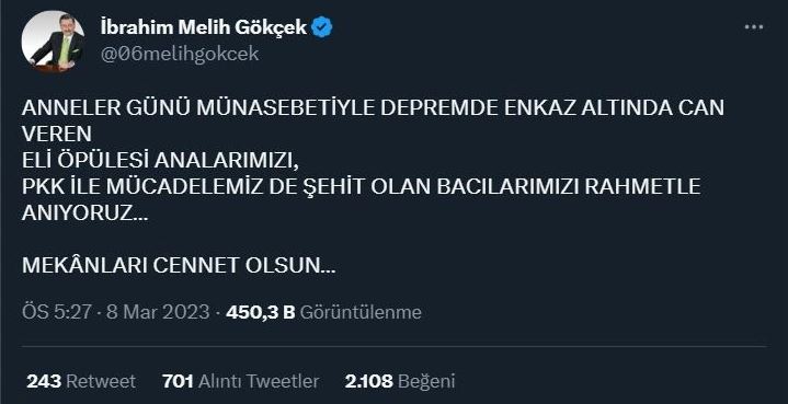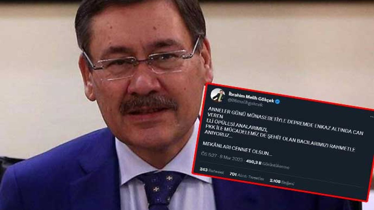 Görevinden el çektirilen AKP'li eski Ankara Büyükşehir Belediye Başkanı Melih Gökçek, sosyal medya hesabından 8 Mart Dünya Kadınlar Günü için bir mesaj yayımladı. Gökçek, tüm annelerin anneler gününü kutladığı kadınlar günü mesajı ile sosyal medyanın gündemine oturdu. https://tele1.com.tr/gece-yuruyusu-sonrasi-kadinlara-polis-mudahalesi-gozaltilar-var-801153/Gökçek'in mesajı şöyle oldu: