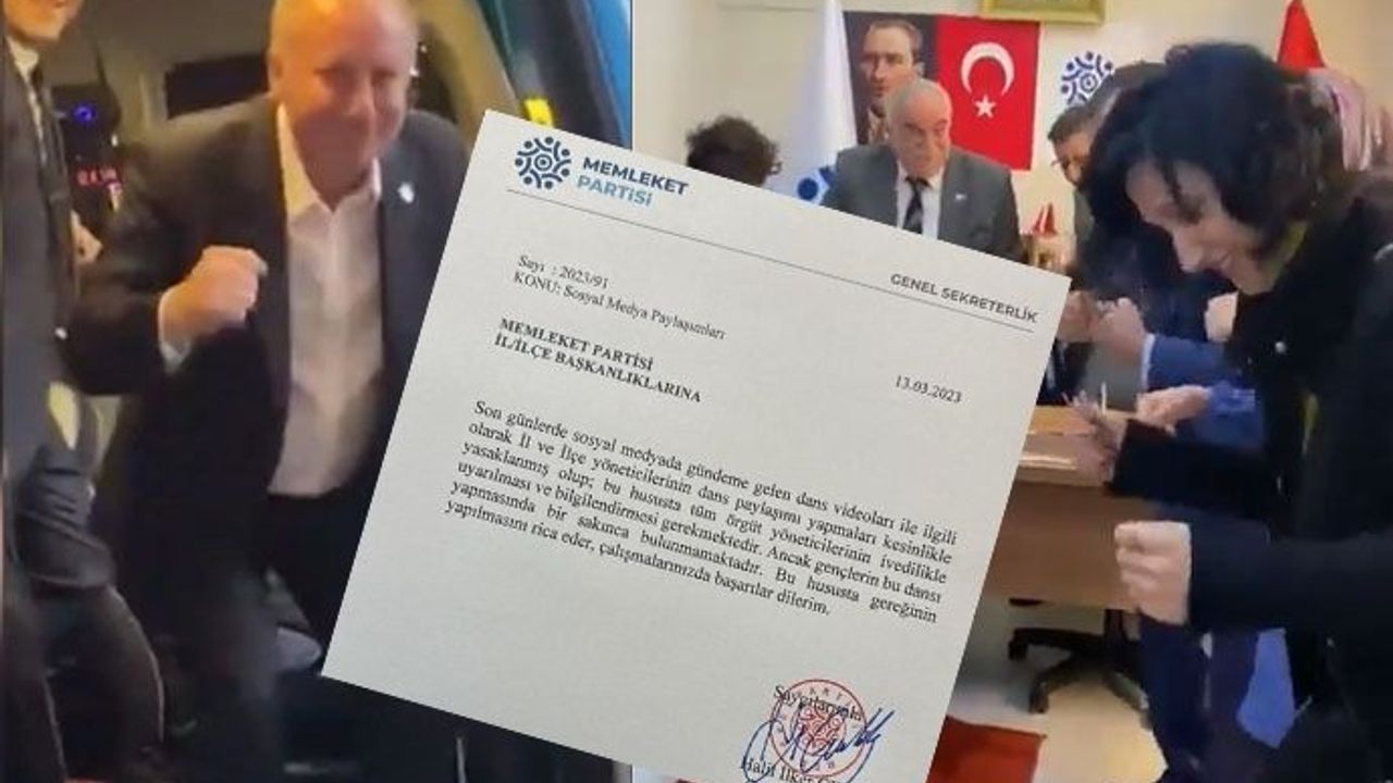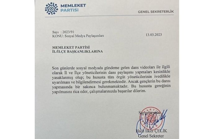 Memleket Partisi İstanbul Fatih İlçe Başkanlığı'nın yayınlayıp tepkiler üzerine sildiği "İnce Dansı" videosunun ardından Memleket Partisi Genel Sekreteri Halil İlker Çelik imzasıyla, parti teşkilatlarına bir genelge gönderildi. https://tele1.com.tr/memleket-partililer-dans-etti-yurttaslar-depremi-hatirlatti-804499/ İl ve ilçe başkanlıklarına gönderilen genelgeyle parti üyelerinin sosyal medyada "İnce dansı" videosu yayınlaması yasaklandı. Genelgede şu ifadeler yer aldı: "Son günlerde sosyal medyada gündeme gelen dans videoları ile ilgili olarak il ve ilçe yöneticilerinin dans paylaşımı yapmaları kesinlikle yasaklanmış olup; bu hususta tüm örgüt yöbneticilerinin ivedilikle uyarılması ve bilgilendirilmesi gerekmektedir. Ancak gençlerin bu dansı yapmalarında bir sakınca bulunmamaktadır. Bu hususta gereğinin yapılmasını rica eder, çalışmalarınızda başarılar dilerim"