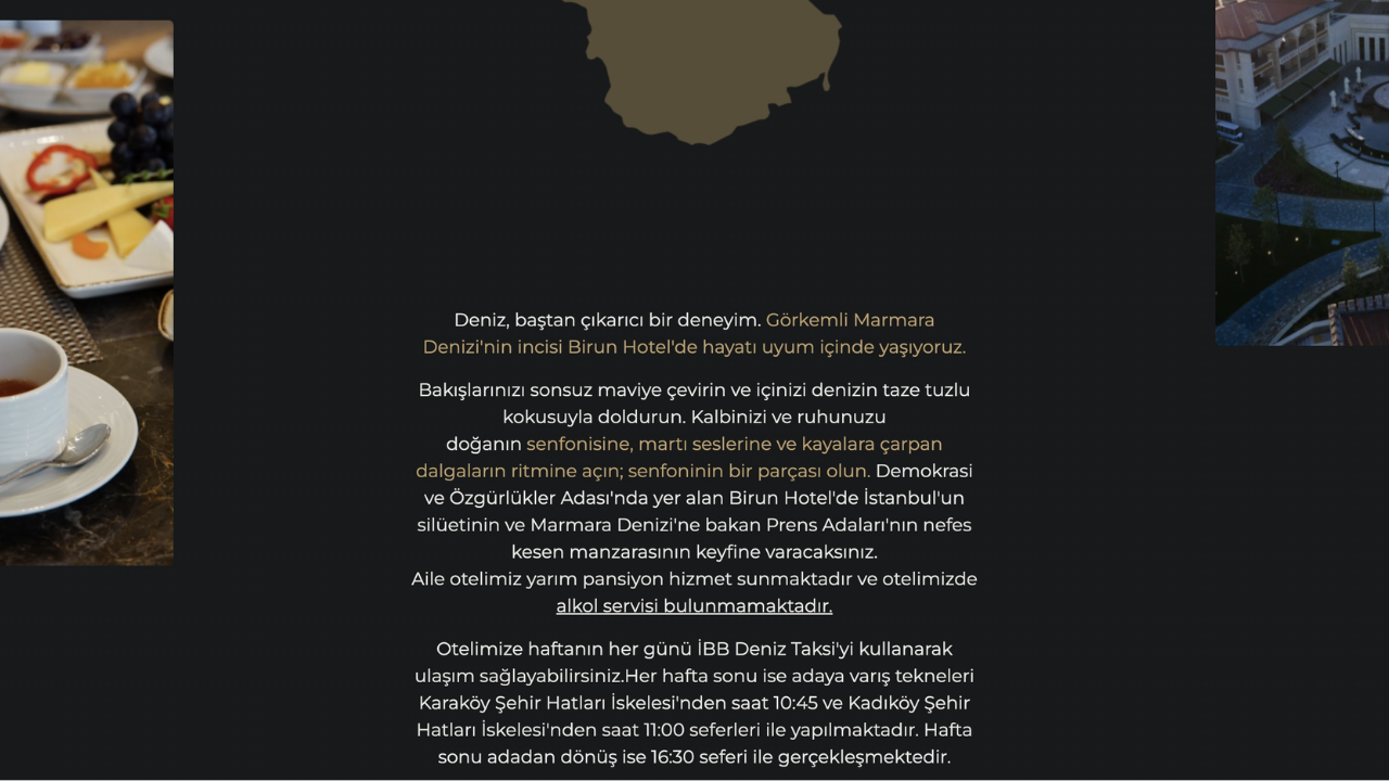 Bakışlarınızı sonsuz maviye çevirin ve içinizi denizin taze tuzlu kokusuyla doldurun. Kalbinizi ve ruhunuzu doğanın senfonisine, martı seslerine ve kayalara çarpan dalgaların ritmine açın; senfoninin bir parçası olun. Demokrasi ve Özgürlükler Adası’nda yer alan Birun Ada Hotel’de İstanbul’un silüetinin ve Marmara Denizi’ne bakan Prens Adaları’nın nefes kesen manzarasının keyfine varacaksınız.'