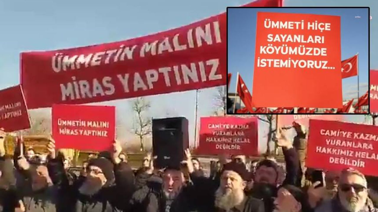 Sakarya Semerkand Kültür Merkezi'nin önünde toplanan grup, "Camiye kazma vuranlara hakkımız helal değildir" yazılı döviz açarak, "Ümmetin malını miras yaptınız" sloganı attı.