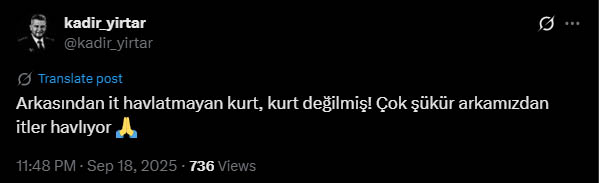 Resmi Gazete’de 11 Eylül'de yayımlanan kararnameyle merkeze alınan eski Erzurum İl Emniyet Müdürü Kadir Yırtar, kentten ayrılırken sosyal medya hesabından yaptığı paylaşımla dikkatleri üzerine çekti. Yırtar, "Arkasından it havlatmayan kurt, kurt değilmiş! Çok şükür arkamızdan itler havlıyor" dedi.