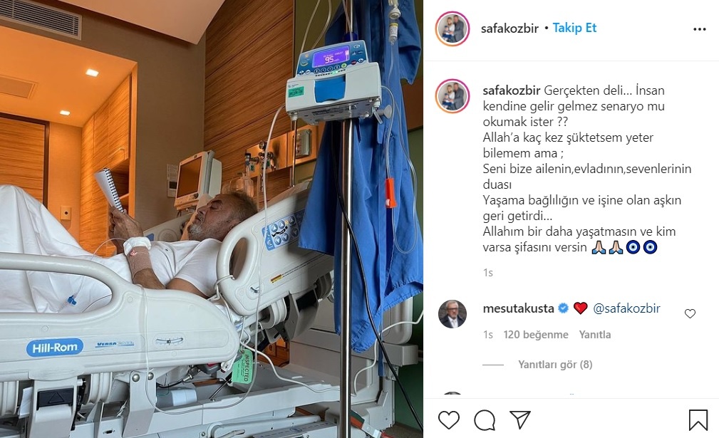 Zorlu süreci atlatan 57 yaşındaki oyuncu gözlerini açtı ve ilk işi senaryo okumak olan usta oyuncunun eşi Özbir Akusta, "Gerçekten deli" dedi, şu mesajı yayınladı: