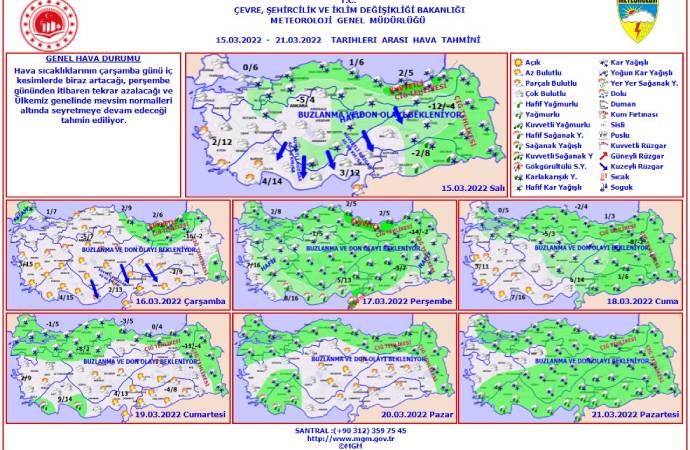 "Haftalık Hava Tahmini (15 - 21 Mart 2022) hava sıcaklıklarının Çarşamba günü iç kesimlerde biraz artacağı, Perşembe gününden itibaren tekrar azalacağı ve ülkemiz genelinde mevsim normalleri altında seyretmeye devam edeceği tahmin ediliyor."