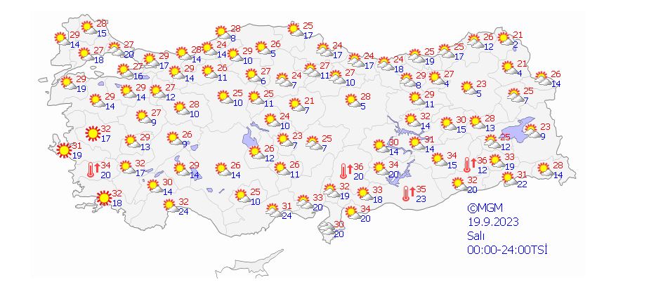Meteoroloji Genel Müdürlüğü tarafından yapılan son değerlendirmelere göre Ülkemizin kuzeydoğu kesimleri ile Doğu Akdeniz’in parçalı, yer yer çok bulutlu, Adana ve Hatay’ın kıyı kesimlerinin yerel olmak üzere sağanak ve gök gürültülü sağanak yağışlı, diğer yerlerin az bulutlu ve açık geçeceği tahmin ediliyor.