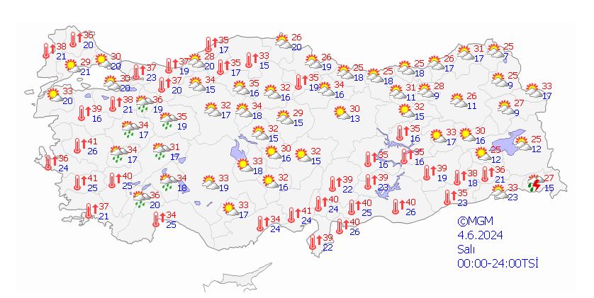 Meteoroloji Genel Müdürlüğü 4 Haziran hava durumu raporunu yayınladı. Son rapora göre sıcaklıklar yurt genelinde mevsim normallerinin 8 ila 12 derece üstünde seyredeceği bildirildi. Dün bakanlık tarafından yaşlı ve kalp rahatsızlığı olanlar için uyarı yapılmıştı. İşte il il hava durumu raporu.
