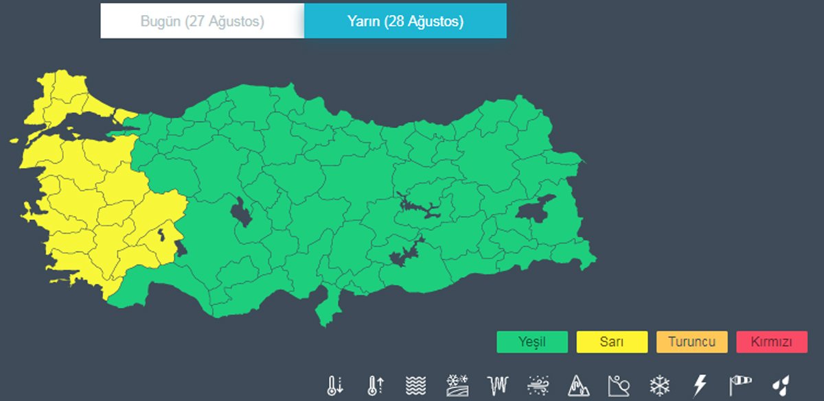 Meteoroloji Genel Müdürlüğü (MGM), 17 ile yarın için sarı uyarı yayınladı. MGM’nin uyarısının Afyonkarahisar, Balıkesir, Bursa, Denizli, Isparta, İzmir, Kütahya, Muğla, Uşak, Aydın, Burdur, Çanakkale, Edirne, İstanbul, Kırklareli, Manisa ve Tekirdağ için geçerli olduğu aktarıldı.SARI UYARI NEDİR?