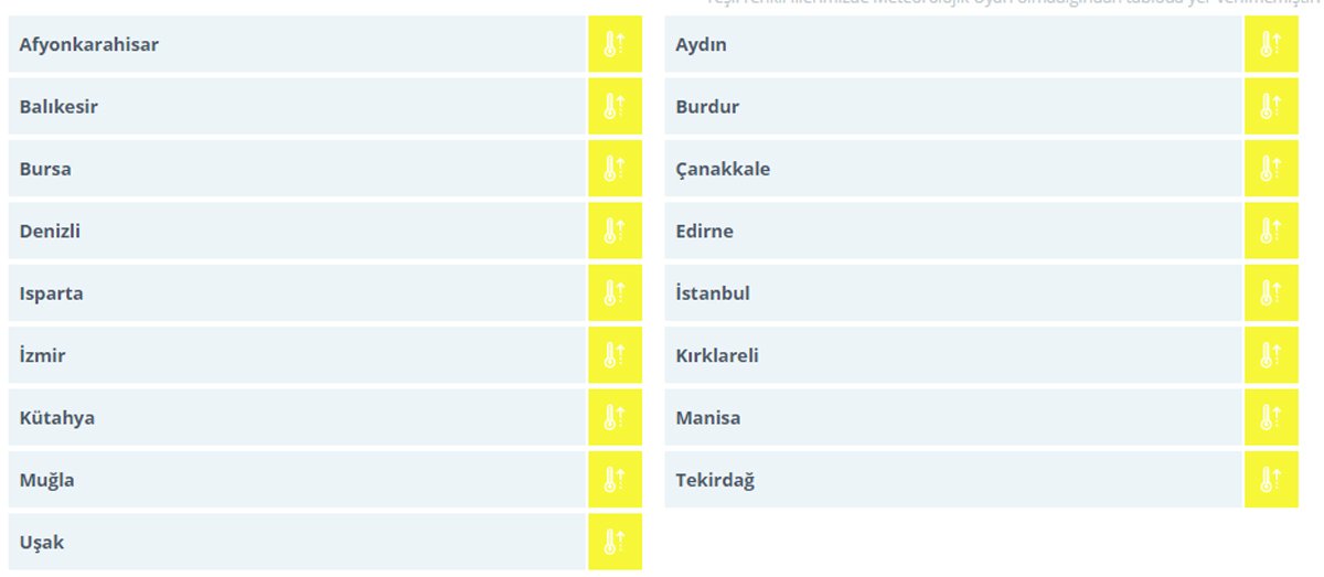 Meteoroloji’nin sarı uyarıya dair açıklamasında “Hava durumu potansiyel tehlikelidir: Tahmin edilen meteorolojik hadise olağandışı olmamakla birlikte, meteorolojik şartlardan etkilenebilecek faaliyetler konusunda dikkatli olunmalıdır” ifadeleri yer almıştı.BİR UYARI DAHA: SICAKLIKLAR 3 İLA 8 DERECENİN ÜZERİNE ÇIKACAK