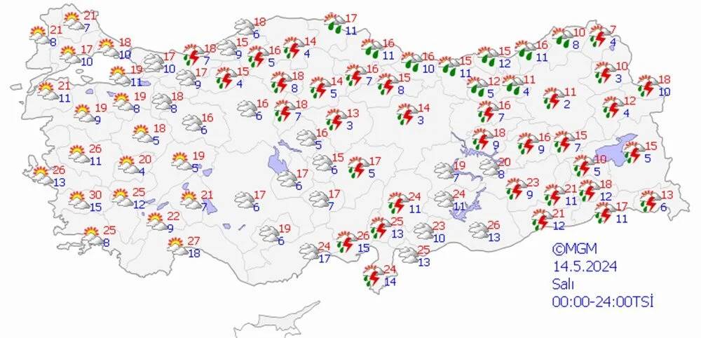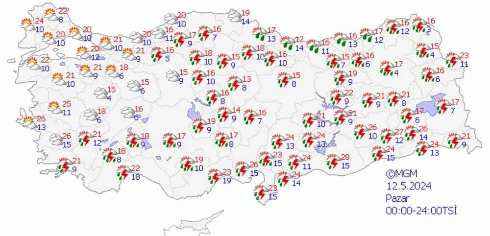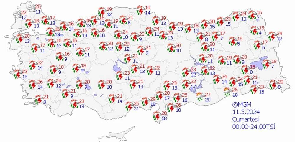 Meteoroloji Genel Müdürlüğü, cumartesi günü için 29 ile sarı kodlu uyarıda bulundu. Sarı kodlu uyarılan iller şöyle: Edirne, Kırklareli, Tekirdağ, İstanbul, Kocaeli, Yalova, Çanakkale, Balıkesir, İzmir, Antalya, Konya, Karaman, Niğde, Adana, Kayseri, Tokat, Sivas, Malatya, Elazığ, Tunceli, Bingöl, Ordu, Giresun, Gümüşhane, Trabzon, Rize, Bayburt, Van ve Hakkari.