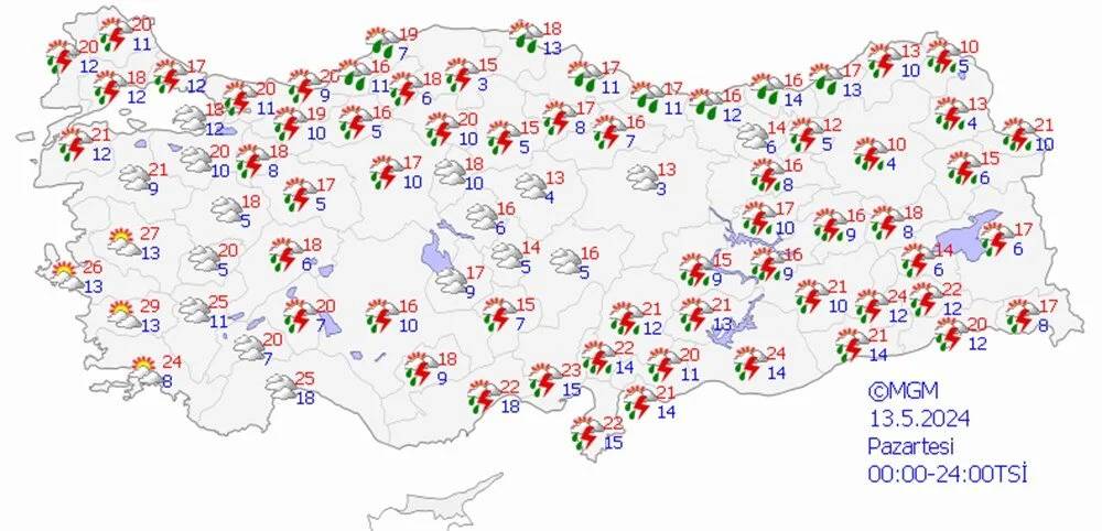 Meteoroloji'nin son raporuna göre ülke genelinde sağanak ve gök gürültülü sağanak beklenirken 29 il için sarı kodlu uyarı yapıldı.