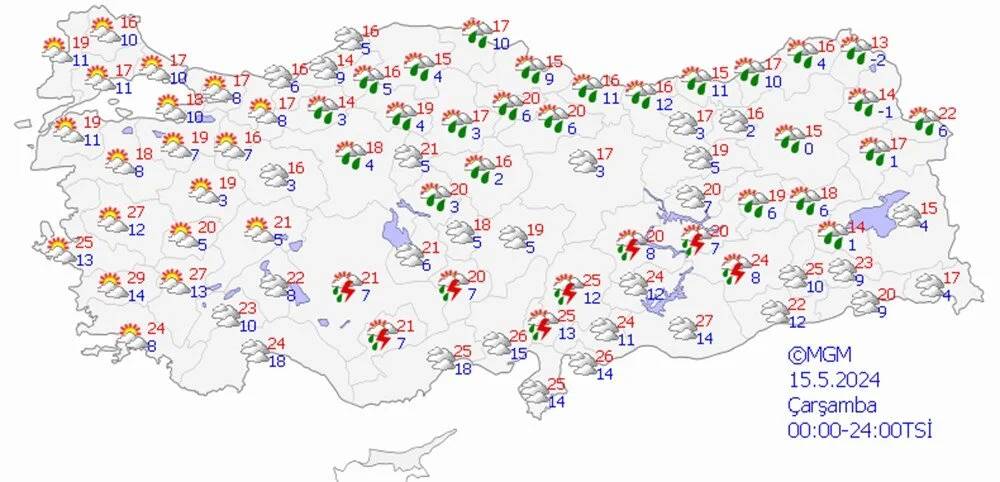 Nisan ayının genelinde etkili olan bahar havası Mayıs ayı ile birlikte yerini soğuk ve yağmurlu havaya bıraktı. Cumartesi günü yağışlar ülke genelinde görülecek. İstanbul ve Bursa'da yağmur sağanak şeklinde ve uzun süreli yağacak. Poyraz kuvvetli esmeye devam ediyor, İstanbul'da sıcaklık 14 dereceye geriledi, Başkent'te de yağmur geçişleri var, İzmir'de cumartesi yağış hafif, rüzgar ise yine şiddetli, Antalya'da yağmur öğleden sonra hafifleyecek. Ankara 18, İzmir 19, Bursa 16, Antalya 24 derece.29 İLE SARI KODLU UYARI