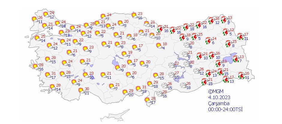 Meteoroloji Genel Müdürlüğü tarafından yapılan son değerlendirmelere göre: Ülkemizin doğu kesimlerinin parçalı ve çok bulutlu, Doğu Karadeniz, Doğu Anadolu’nun doğusu, Ordu, Batman, Siirt ve Mardin çevreleri ile Hatay'ın kıyı kesimlerinin yerel olmak üzere sağanak ve gök gürültülü sağanak yağışlı, diğer yerlerin az bulutlu ve açık geçeceği tahmin ediliyor. Yağışların, Doğu Anadolu’nun güneydoğusu, Rize ve Siirt çevreleri ile Artvin’in kıyı kesimlerinde yer yer kuvvetli olması bekleniyor.