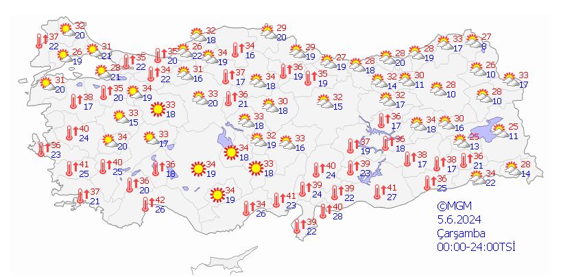 Meteoroloji Genel Müdürlüğü 5 Haziran hava durumu raporunu yayınladı. Son rapora göre yurt genelinde sıcaklıkların mevsim normallerinin 8 ila 12 derece üstünde seyredeceği kaydedildi. İşte il il hava durumu raporu.