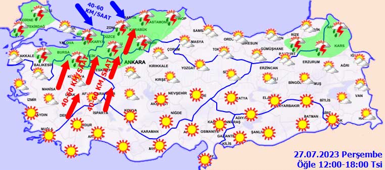 Az bulutlu ve açık, zamanla parçalı bulutlu, öğle saatlerinden sonra kuzey ve batı kesimleri yerel olmak üzere sağanak ve yer yer gök gürültülü sağanak yağışlı