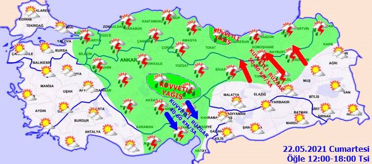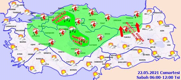 Rüzgarın; bu akşam ve gece saatlerinde Kuzey Ege kıyıları, İç Anadolu’nun batısında kuzeyli yönlerden, akşam saatlerinden itibaren Doğu Karadeniz’in iç kesimleri ile Doğu Anadolu’nun kuzeyinde, yarın Doğu Anadolu’nun kuzeyinde kuvvetli ve kısa süreli fırtına (40-80 km/sa) şeklinde esmesi bekleniyor.