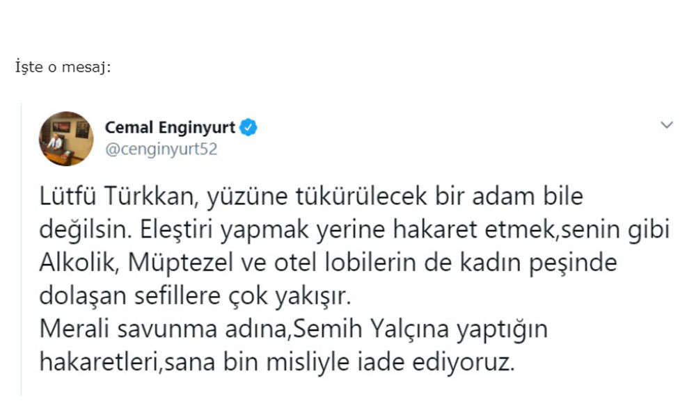 Bu kez MHP Milletvekili Cemal Enginyurt, İYİ Parti Grup Başkanvekili Lütfü Türkkan’a yanıt verdi. MHP’li Cemal Engünyurt, sosyal medya hesabından “Lütfü Türkkan, yüzüne tükürülecek bir adam bile değilsin. Eleştiri yapmak yerine hakaret etmek, senin gibi Alkolik, Müptezel ve otel lobilerin de kadın peşinde dolaşan sefillere çok yakışır. Merali savunma adına, Semih Yalçına yaptığın hakaretleri, sana bin misliyle iade ediyoruz” mesajını paylaştı.