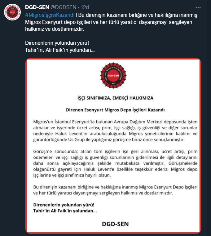 Düşük zamlara karşı eylem yapan Migros işçileri mücadelelerini kazandığı, sanatçı Haluk Levent tarafından duyuruldu. Haluk Levent'in açıklamasından sonra da DGD-SEN işçilerin ücretleri ve primleri konusunda firma yetkilileriyle anlaşıldığını duyurdu.