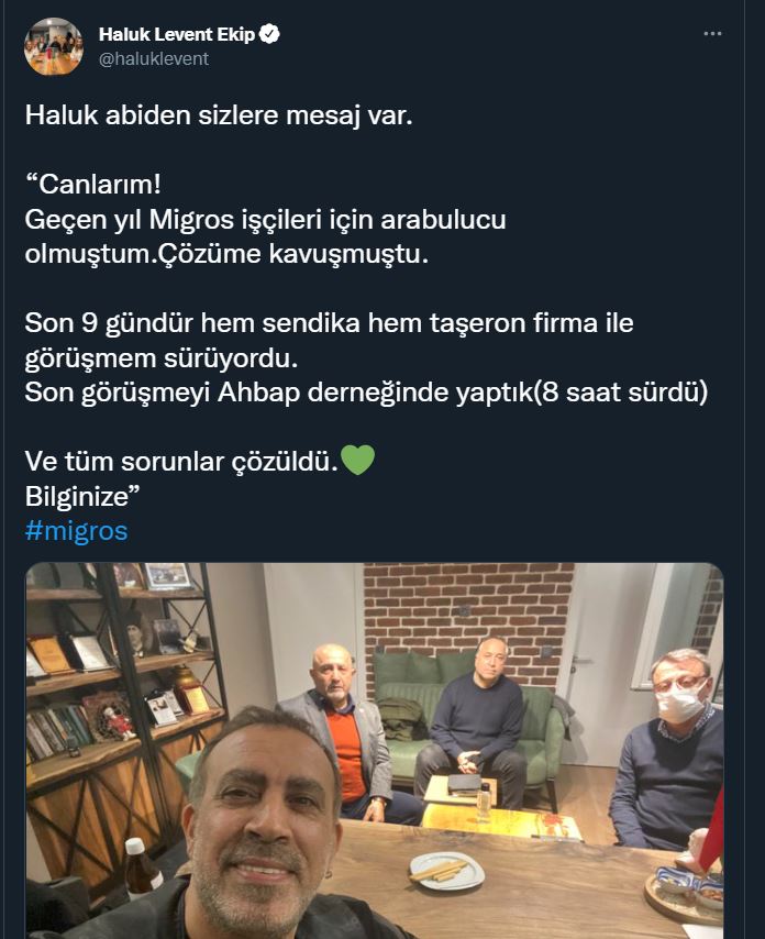 "Haluk abiden sizlere mesaj var. “Canlarım! Geçen yıl Migros işçileri için arabulucu olmuştum. Çözüme kavuşmuştu. Son 9 gündür hem sendika hem taşeron firma ile görüşmem sürüyordu. Son görüşmeyi Ahbap derneğinde yaptık(8 saat sürdü) Ve tüm sorunlar çözüldü. Bilginize”