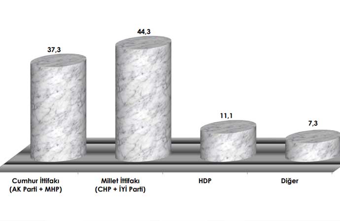 Yapılan araştırmaya göre, AKP ve CHP arasındaki oy oranı yüzde 1,3'e düşerken, Millet İttifakı ise Cumhur İttifakı'nı geçti. Millet İttifakı'na oy veririm diyenlerin oranı yüzde 44,3 iken Cumhur İttifakı'na oy vereceğini söyleyenlerin oranı yüzde 37,3 oldu.