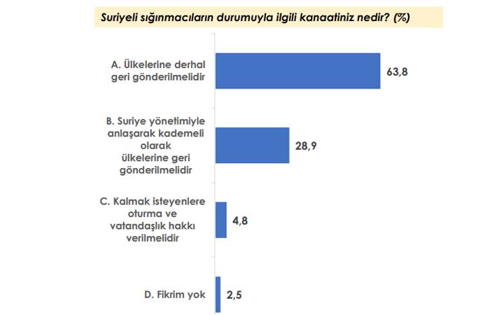 "Suriyeli sığınmacıların durumuyla ilgili kanaatiniz nedir?" sorusuna ise çoğunluk olan "Ülkelerine derhal geri gönderilmelidir" diyenleri Suriye yönetimiyle anlaşarak kademeli olarak ülkelerine geri gönderilmelidir" diyenler izledi. "Kalmak isteyenlere oturma ve vatandaşlık hakkı verilmeli" diyenler ise azınlıkta kaldı.