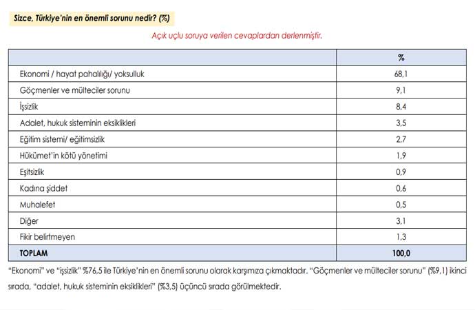 Ankette yer alan, "Sizce, Türkiye’nin en önemli sorunu nedir?" sorusuna ise büyük çoğunluk, "Ekonomi / hayat pahalılığı/ yoksulluk" dedi. İkinci en büyük sorun göçmenler olurken üçüncü sırada ise işsizlik sorunu yer aldı.
