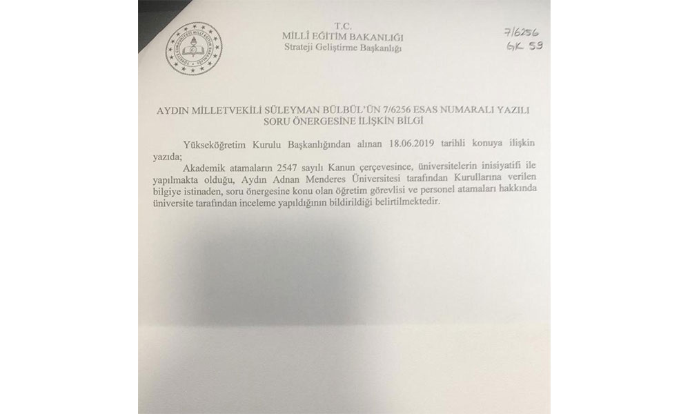 Soru önergesindeki soruları yanıtsız bırakan Bakan Selçuk, yalnızca akademik atamaların üniversitelerin inisiyatifi ile yapılmakta olduğunu belirterek soru önergesine konu olan öğretim görevlisi ve personel atamaları hakkında inceleme yapıldığının bildirildi. Bakan, Bülbül'ün şu sorularını ise yanıtsız bıraktı: “Üniversiteye atanan kişilerin rektörünün, dekanların, dekan yardımcılarının ve öğretim görevlilerinin birinci derece yakınlarının olması tesadüf müdür? Bu atamalar yasal bir engel olmasa bile eğitim meslek etiğine uygun mudur? Adnan Menderes Üniversitesi’ne yapılan öğretim görevlisi ve personel atamalarında hangi kriterler göz önüne alınmıştır? Üniversiteye alımlarda karar mekanizmasında söz sahibi olan üniversite rektörü ve dekanlar, alınan kişilerle ilgili yaptıkları mesleki değerlendirmede ne kadar objektif olabilmişlerdir?”