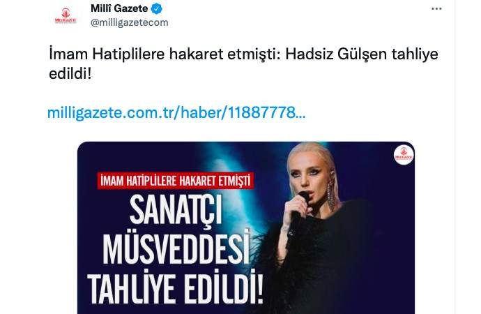 Geçtiğimiz günlerde hukuksuzca gözaltına alınan sanatçı Gülşen mahkeme kararıyla tahliye edildi. Milli Gazete’nin bu haberi verirken kullandığı dil ise dikkat çekti.