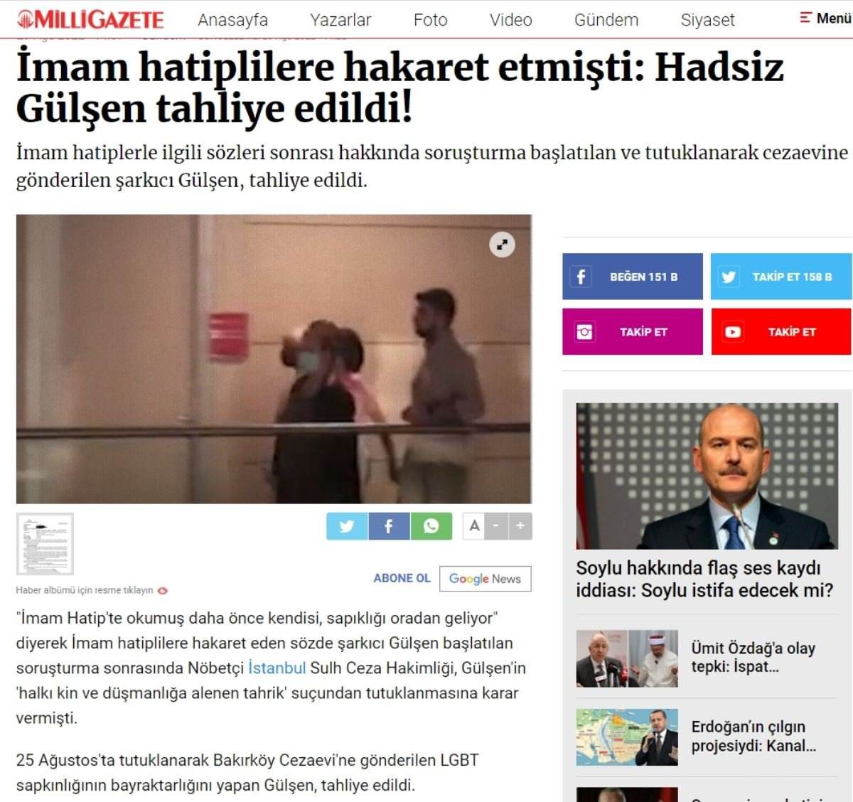 'İmam Hatip'te okumuş daha önce kendisi, sapıklığı oradan geliyor' diyerek İmam hatiplilere hakaret eden sözde şarkıcı Gülşen başlatılan soruşturma sonrasında Nöbetçi İstanbul Sulh Ceza Hakimliği, Gülşen'in 'halkı kin ve düşmanlığa alenen tahrik' suçundan tutuklanmasına karar vermişti.
