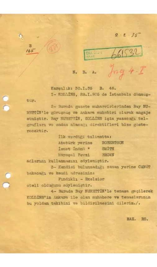 "Kollins, 28 Ocak 1935'te İstanbul'a dönmüştür. Buradan gazete muharrirlerinden Bay Nurettin'le görüşmüş ve Ankara muhabiri olarak angaje etmiştir. Bay Nurettin, Kollins için yazacağı telgrafları ve ondan alacağı direktifleri bize gösterecektir.