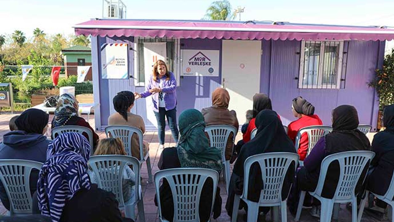 Kadın ve Aile Hizmetleri Daire Başkanlığı meslek elemanları ve Mor Yerleşke’de görev alan sağlık personeli tarafından, Mor Yerleşke’den ve Kadın ve Aile Hizmetleri Dairesi Başkanlığı'ndan hizmet alan 21 kadına şiddet konusunda ve yasal hakları ile ilgili bilgilendirme yapıldı. Atölyede kadına yönelik şiddetle mücadele kapsamında Adana Büyükşehir Belediyesi'nin ve Daire Başkanlığı’nın şiddetle mücadele konusunda yaptığı çalışmalar ve sunmuş olduğu hizmetleri daire başkanı tarafından anlatılarak, şiddetin her türlüsünün suç olduğu ve insan hakkı ihlali olduğu vurgusunu yapılarak, kadınlara dektek verilmeye devam edileceği belirtildi. Atölyede kadına yönelik şiddet, şiddet türleri, şiddetin kadın sağlığı üzerindeki etkileri, 6284 Sayılı Ailenin Korunması ve Kadına Yönelik Şiddetin Önlenmesine Dair Kanun kapsamında kadınların yasal hakları konularında bilgilendirme yapıldı. Şiddete maruz kalınması durumunda başvurulacak kurum ve kuruluş bilgileri ve acil durum numaraları ile ilgili bilgisi de aktarıldı. Atölyeye katılan kadınlara; kadına yönelik şiddetle mücadele bilgilendirme ve kadın sağlığı broşürleri dağıtılarak bireysel soruları olanlara da danışmanlık hizmeti sunuldu.
