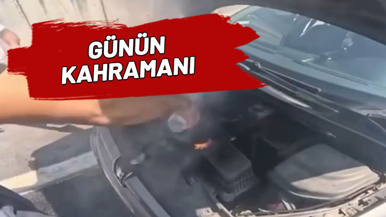 Motorcu araçtakilerin kişisel eşyalarını da kurtardıktan sonra, yine aynı araçta bulunan yangın tüpünü de kullanarak motordaki yangını söndürdü. O anlar motorcunun kask kamerasına yansıdı.