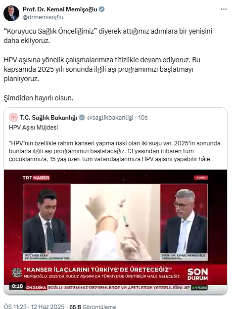 “Başka bir müjde vermek istiyorum. Biliyorsunuz özellikle bu HPV ile ilgili spekülasyonlar oluyor. Onunla ilgili biz de bir çalışma yaptık. Biliyorsunuz bunun esasında 200 tipi var. Farklı varyasyonları var. Esas kanser yapma riski olan, özellikle rahim kanseri riski olan iki tane suşu var. Bunlarla ilgili de aşı programına başlatacağız. 2025’in sonunda 13 yaşındaki bütün çocuklarımıza, isteyen çocuklarımıza HPV aşısını yapabilir hale getireceğiz. 15 yaşın üzerindekileri de isteyenlerin aşılarını yapacak hale geleceğiz."