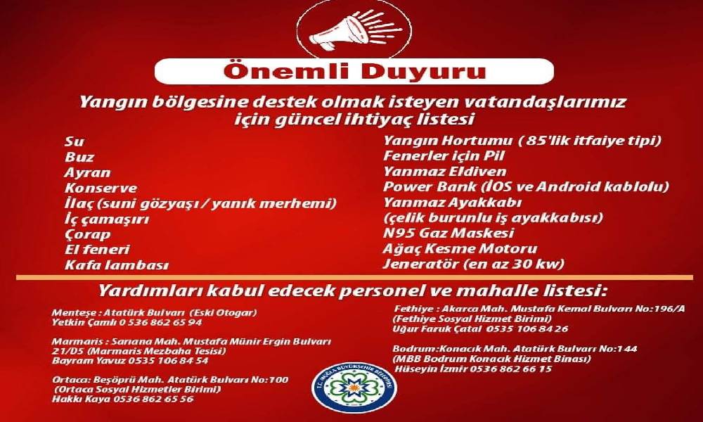 Muğla Büyükşehir Belediyesi, ilin birçok noktasında meydana gelen ve henüz söndürülemeyen yangınlar sebebiyle ihtiyaç listesi düzenledi.