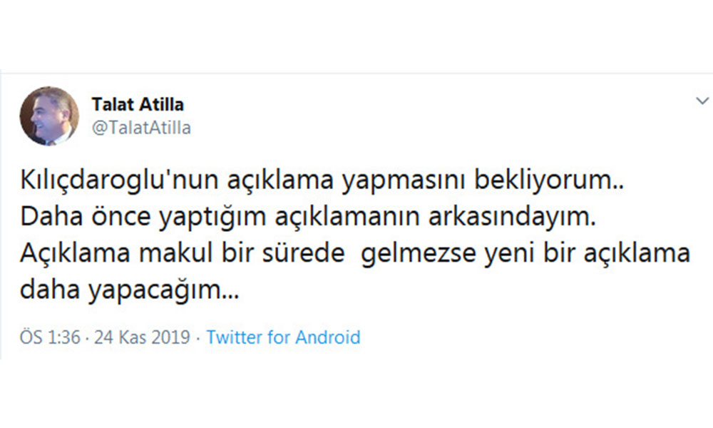 Sözcü Gazetesi yazarı Rahmi Turan'ın 'Saray'a giden CHP'li Muharrem İnce' iddiası haberinin kaynağı gazeteci Talat Atilla'dan yeni açıklama. Talat Atilla, Muharrem İnce canlı yayında açıklama yaparken sosyal medya hesabından açıklama yaptı. Atilla mesajında CHP Genel Başkanı Kemal Kılıçdaroğlu'na çağrıda bulundu. https://tele1.com.tr/ince-beni-yipratmak-icin-harcadiklari-enerjiyi-akpye-harcasalar-emin-olun-iktidar-olurlar-103633/ Talat Atilla'nın yeni açıklaması şöyle: "Kılıçdaroglu'nun açıklama yapmasını bekliyorum.. Daha önce yaptığım açıklamanın arkasındayım. Açıklama makul bir sürede gelmezse yeni bir açıklama daha yapacağım..."