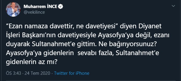 Namaz sonrası sosyal medya hesabından açıklama yapan İnce, "“Ezan namaza davettir, ne davetiyesi” diyen Diyanet İşleri Başkanı’nın davetiyesiyle Ayasofya’ya değil, ezanı duyarak Sultanahmet’e gittim. Ne bağırıyorsunuz? Ayasofya’ya gidenlerin sevabı fazla, Sultanahmet’e gidenlerin az mı?" ifadelerini kullandı.