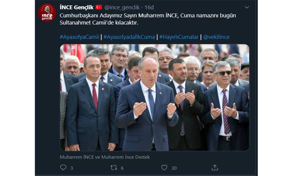 Muharrem İnce Cuma namazı için Ayasofya diye yola çıktı ancak namazı Ayasofya yerine Sultanahmet Camii’nde kıldı. https://tele1.com.tr/muharrem-inceden-metin-temel-tartismasi-193198/
