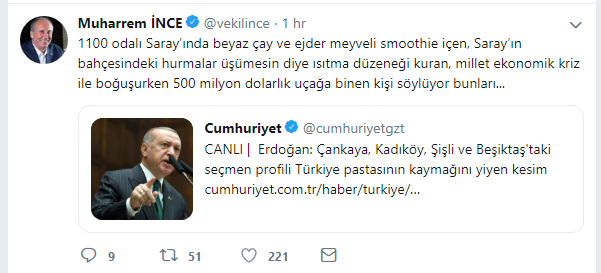 Muharrem İnce, Twitter hesabından yaptığı paylaşımla Erdoğan'a yanıt verdi. İnce, "1100 odalı Saray’ında beyaz çay ve ejder meyveli smoothie içen, Saray’ın bahçesindeki hurmalar üşümesin diye ısıtma düzeneği kuran, millet ekonomik kriz ile boğuşurken 500 milyon dolarlık uçağa binen kişi söylüyor bunları..." ifadelerini kullandı.